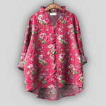 Romantiški lininiai marškiniai ryškiai rožinės spalvos su gėlių raštu iš rožių, kurie skleidžia moteriškumą ir eleganciją. V formos iškirptė su subtiliais volanais ir laisvas siluetas suteikia komfortą ir lengvą pojūtį, o asimetriškas apdaila su ilgesne nugarine dalimi prideda modernumo kiekvienam įvaizdžiui.