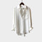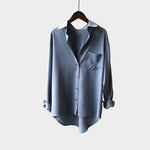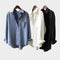 Elegantiški marškiniai pilkos spalvos su balta apykakle. Laidūs siluetas ir šiek tiek asimetrinis apdaila suteikia komfortą ir šiuolaikišką estetiką kiekvienai dienai.