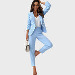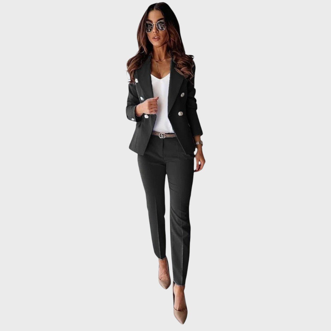Moteriškas kostiumas „Laura“ įkūnija klasikinį rafinuotumą su moderniu akcentu. Dvieilio švarko dizainas su elegantiškomis metalinėmis sagomis ir tobulai priderintos kelnės sukuria griežtą, įliemenuotą siluetą, kuris spinduliuoja pasitikėjimu ir elegancija. Nesvarbu, ar biure, verslo susitikimuose, ar iškilminguose vakaro renginiuose – „Laura“ garantuoja nepriekaištingą siluetą ir rafinuotą įvaizdį.