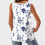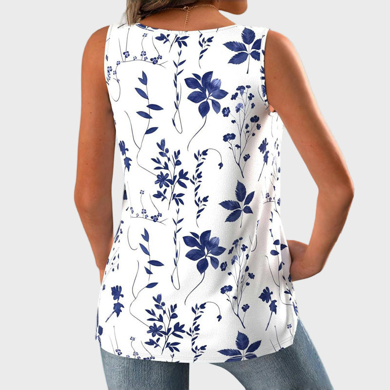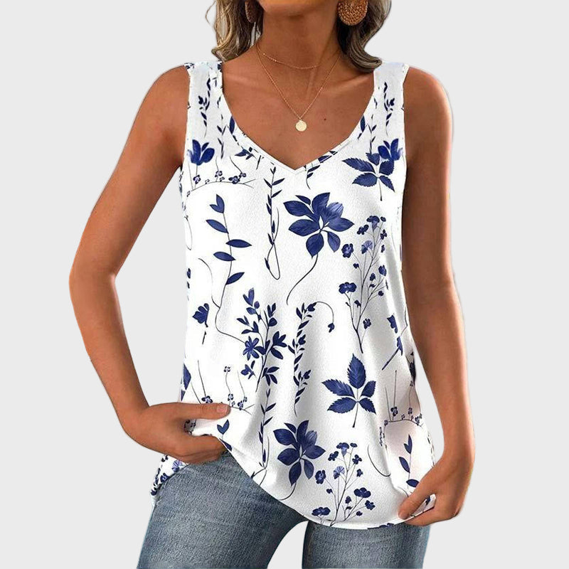 Pasimėgaukite vasaros gaiva su šiuo be rankovių viršumi baltoje bazėje, puoštu mėlynais gėlių raštais. Atsipalaidavusi linija suteikia komfortą ir judėjimo laisvę, o V formos iškirptė suteikia moteriškumo ir elegancijos. Ideali dalis kasdieniams ir vasariniams įvaizdžiams.