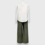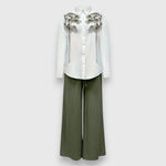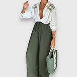 Nivana komplektas sujungia elegantišką palaidinę su subtiliu gėlių raštu ir laisvus kelnes su plačiomis kojomis – puikus pasirinkimas stilingoms dienoms. Lengvas audinys ir aukštas apykaklė suteikia visumai moterišką, reikalaujančią akcentą.