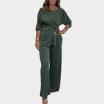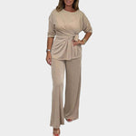Patogus ir elegantiškas komplektas, sudarytas iš marškinėlių su juosmens surišimu ir plačių kelnių. Idealiai tinka kasdieniams pasirodymams ir atsipalaidavusiems išėjimams, suteikia judėjimo laisvę ir modernų stilių.