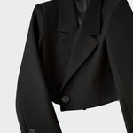 Minimalistinis trumpas švarkas su elegantišku dizainu ir moderniomis detalėmis. Aštrus apykaklės kirpimas ir priekinis užsegimas suteikia dinamišką charakterį, o trumpas siluetas jį daro idealiu stilingoms išvaizdoms. Jis lengvai dėvimas tiek profesinėse, tiek vakarėlių progose.