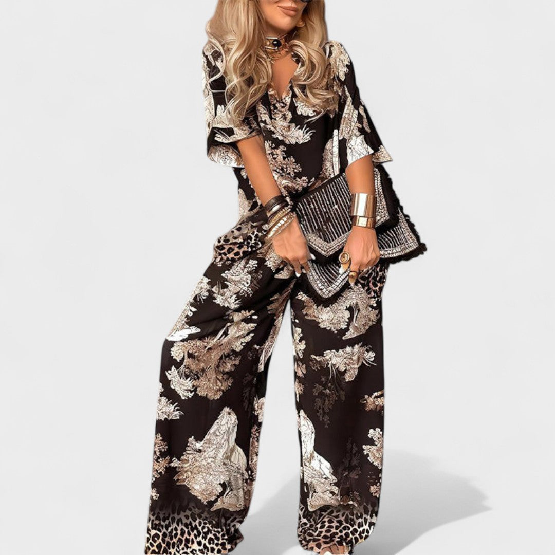 Šis elegantiškas ir laisvas komplektas yra tobulas modernios sofistikacijos apibrėžimas. Su drąsiu raštu ir laisvu kirpimu, jis suteikia įspūdingą išvaizdą, neaukodamas komforto. Nesvarbu, ar tai būtų ypatinga vakarienė, renginys, ar netgi norint suteikti šiek tiek šarmo kasdienybei, šis komplektas yra teisingas pasirinkimas tiems, kurie nori išsiskirti su klase.