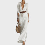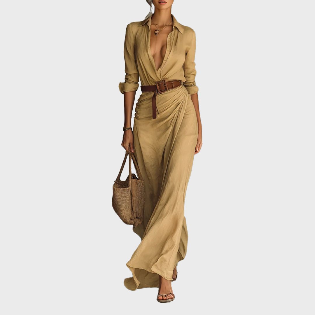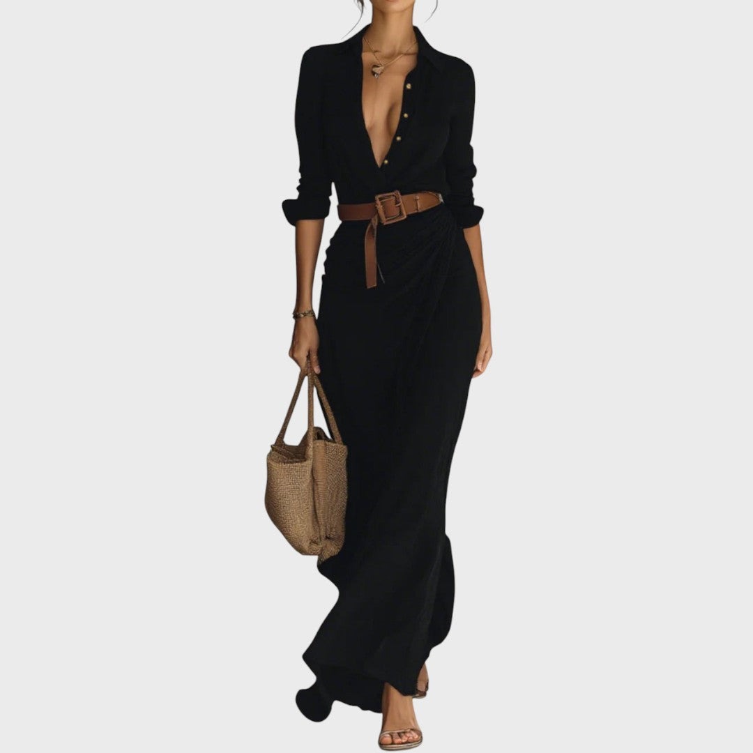 Šis moteriškas ilgas suknelės modelis sujungia patogumą ir rafinuotumą. Diržas subtiliai pabrėžia liemenį, sukuriant elegantišką siluetą, o ilgesnės rankovės su rankogaliais suteikia klasikinį ir išpuoselėtą akcentą. Lengvas kirpimas užtikrina tobulą komfortą bet kuriuo metų laiku – tiek kasdienėms elegantiškoms derinių variacijoms, tiek vakariniams chic įvaizdžiams.