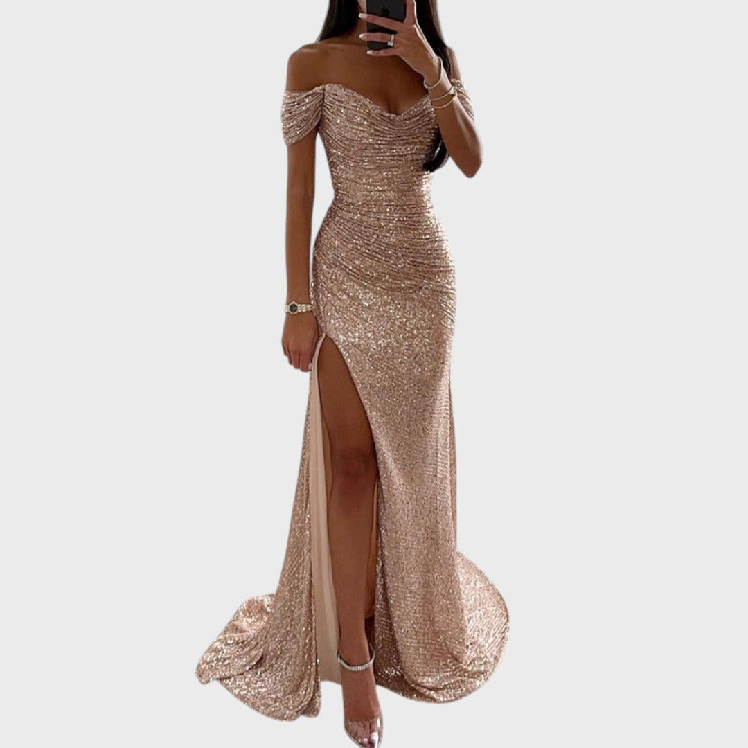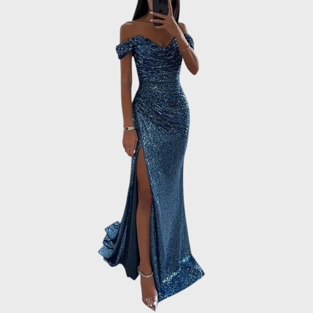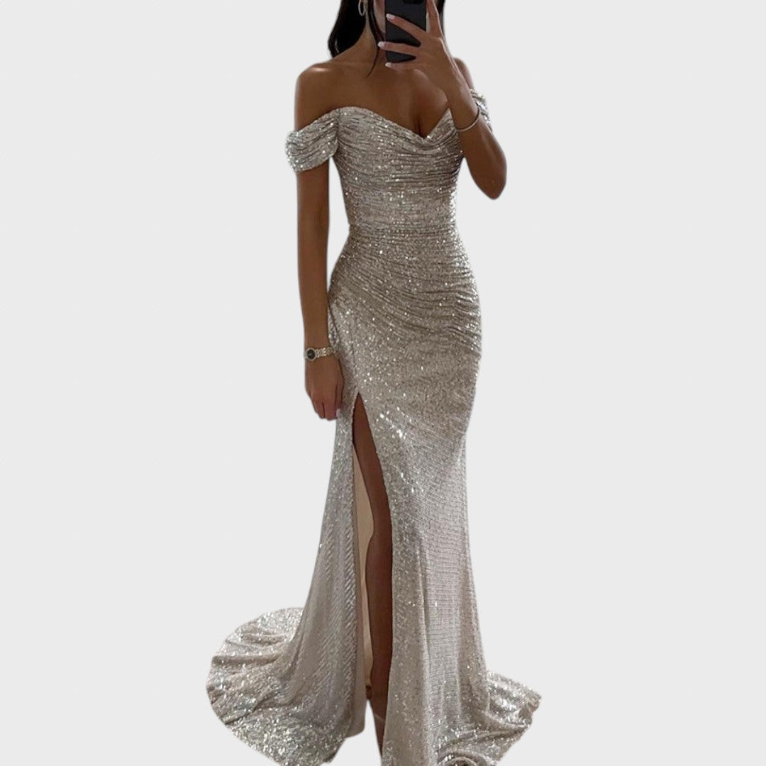 Kamila | Moteriška blizgi suknelė nuogu pečiu