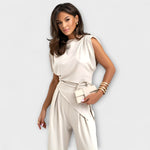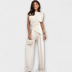 Skulptūrinis elegantiškumas su šiuolaikine nuojauta: Sofia komplektas derina asimetrinę viršūnę su plačiomis kelnėmis, sukuriant elegantišką ir grakščią siluetą. Idealiai tinka ypatingoms progoms arba norint be vargo pakelti kasdienį įvaizdį.