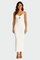 Įspūdinga balta suknelė siaura linija, kuri elegantiškai pabrėžia siluetą. Ji turi plonas petnešas, subtilų iškirpimą krūtinėje ir maxi ilgį, suteikiantį laikui nepavaldaus stiliaus. Ideali vasaros vakarams, oficialioms progoms ar elegantiškoms išvaizdoms su minimalizmo charakteriu.