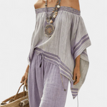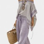 Natūralus bohemiškas stilius su laisvu elegancijos pojūčiu. Daisy komplektas sudaro viršutinę dalį su Bardot apykakle ir netaisyklingais akcentais, kartu su plačiomis kelnėmis, puikiai tinkančiomis pakrantės pasivaikščiojimams ar saulėtoms popietėms su natūralia žavesiu. Pagamintas iš bambuko su švelnia tekstūra ir laisvu kritimu, jis suteikia gaivumo ir lengvumo pojūtį su rankų darbo akcentu.