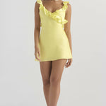 Žaisminga ir moteriška mini suknelė, kuri derina eleganciją ir gaivumą. Asimetrinė detalė su volanais dekoltė suteikia išskirtinį judesį ir stilių, o siaura forma patraukliai pabrėžia siluetą. Ideali vasaros vakarams ir elegantiškoms išvykoms.