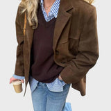Dana – tai šilta, ruda, laisvo kirpimo rudeninė striukė iš zomšos imitacijos, sukurta suteikti stiliaus ir jaukumo vėsesnėmis dienomis. Jos minimalistinis siluetas, viena saga ir minkšta tekstūra pabrėžia subtilų rafinuotumą, derantį prie kiekvienos spintos.