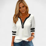 Stilinga T-marškiniai, derinanti sportinį stilių su šiuolaikiniu elegancija. Su V-formos iškirpte ir užtrauktuku, taip pat įspūdingais spalvų blokų raštais, tai idealu, kad išsiskirtum patogiai visą dieną.
