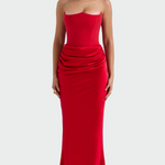 Įspūdinga ir jausminga suknelė be petnešų, su prigludusia siluetu, kuris pabrėžia figūrą. Išskirtinė detalė su elegantiškomis raukšlėmis ties juosmeniu suteikia moteriškumo ir unikalumo, o maksi ilgis prideda laikinos elegancijos. Puikiai tinka oficialioms vakarėliams ir spindinčioms išvaizdoms.