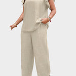 Šis šviesiai violetinis komplektas su plačiomis kelnėmis ir bluzone su raukiniais ant rankovių derina stilių ir patogumą, idealiai tinka bet kokiai progai – nuo popietinės pasivaikščiojimo iki ypatingo išėjimo.
