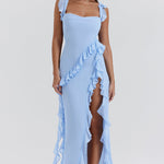 Žaisminga ir elegantiška suknelė su rafinuotomis detalėmis, kurios pabrėžia moteriškumą. Prigludusi korsetas kartu su volanais ir įpjova suteikia judesio ir unikalumo. Ideali vakariniams pasimatymams ir ypatingoms progoms.