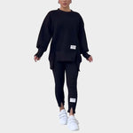 Mėgaukitės absoliučiu patogumu ir stiliumi su šiuo juodu sportiniu komplektu, idealiu kasdienėms išvaizdoms su moderniu charakteriu. Komplektą sudaro ilgarankovė sportinė palaidinė ir patogūs kelnių legingai, derinant kasdienę nuotaiką su elegantiškomis detalėmis.
