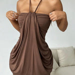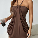 Šokoladinis Mini Suknelė Su Kaklo Užrišimu