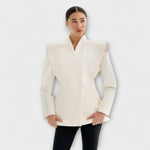 Valerija Skulptūrinė Pečių Striukė yra šiuolaikinis jėgos drabužis, derinantis švarias linijas ir architektūrinę dramą. Puikiai tinka galerijų renginiams, mados vakarienėms arba norint padaryti įspūdį darbo vietoje.