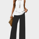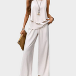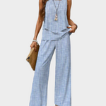 Įkvėpkite gaivumo ir stiliaus su šiuo šauniu moterišku komplektu, kuris sujungia elegantišką be rankovių megztinį su plačiomis kelnėmis su lapų raštu. Puikiai tinka šiltoms dienoms, atsitiktinėms išvykoms ar atostogoms, siūlo unikalų komfortą ir rafinuotą išvaizdą.